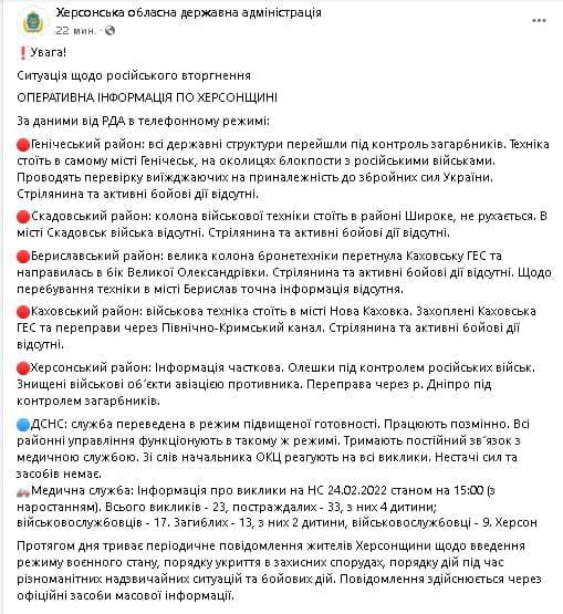 Залужный заверил, что по состоянию на 00:00 25 февраля группировка сил обороны ведет организованную оборонную операцию на юге. Идут оборонительные бои в районе восточнее Херсона. Механизированные подразделения ВСУ отбили автомобильный мост и закрепились на левом берегу Днепра.
