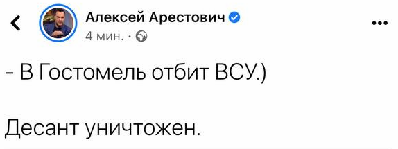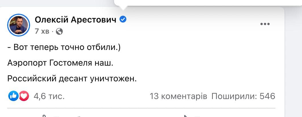 20:45 Арестович говорит, что аэропорт в Гостомеле отбит у россиян, а десант уничтожен.