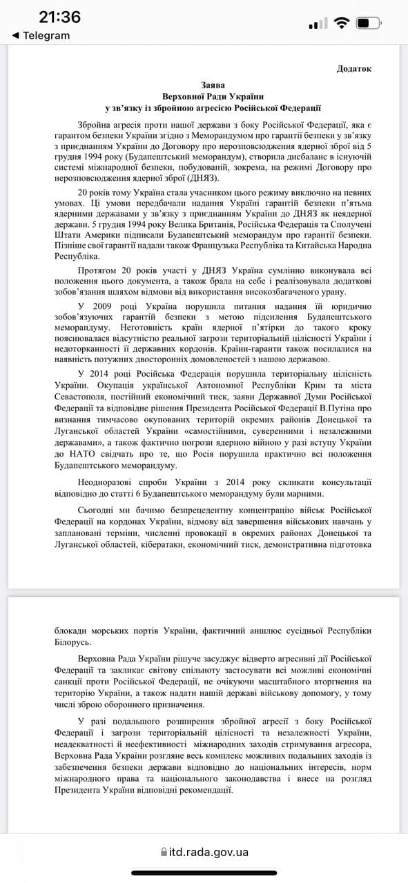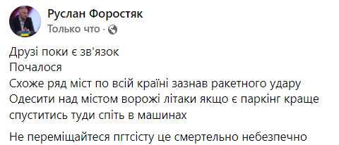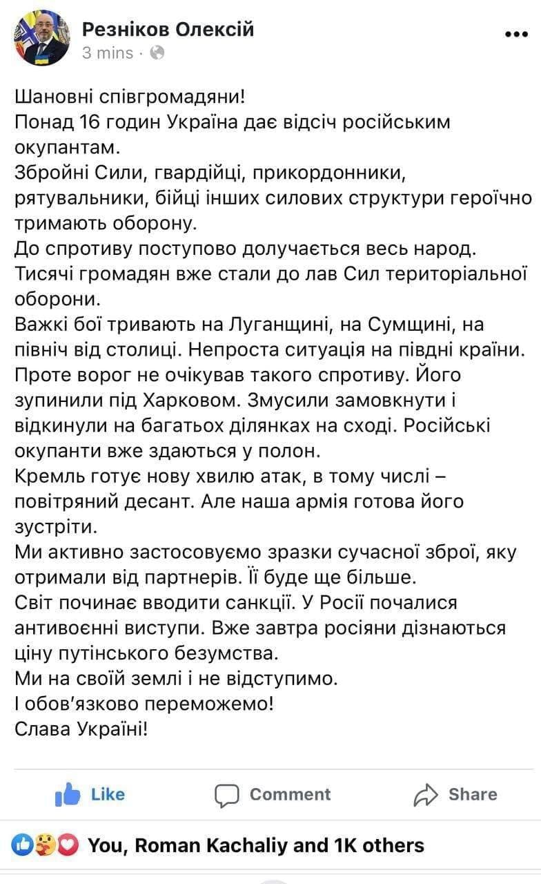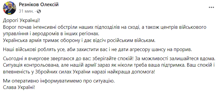 22:21 Министр обороны Резников написал, что Украина дает отпор вооруженной российской агрессии уже 16 часов. ВСУ держит оборону. Теперь Кремль готовит волну новых воздушных атак.