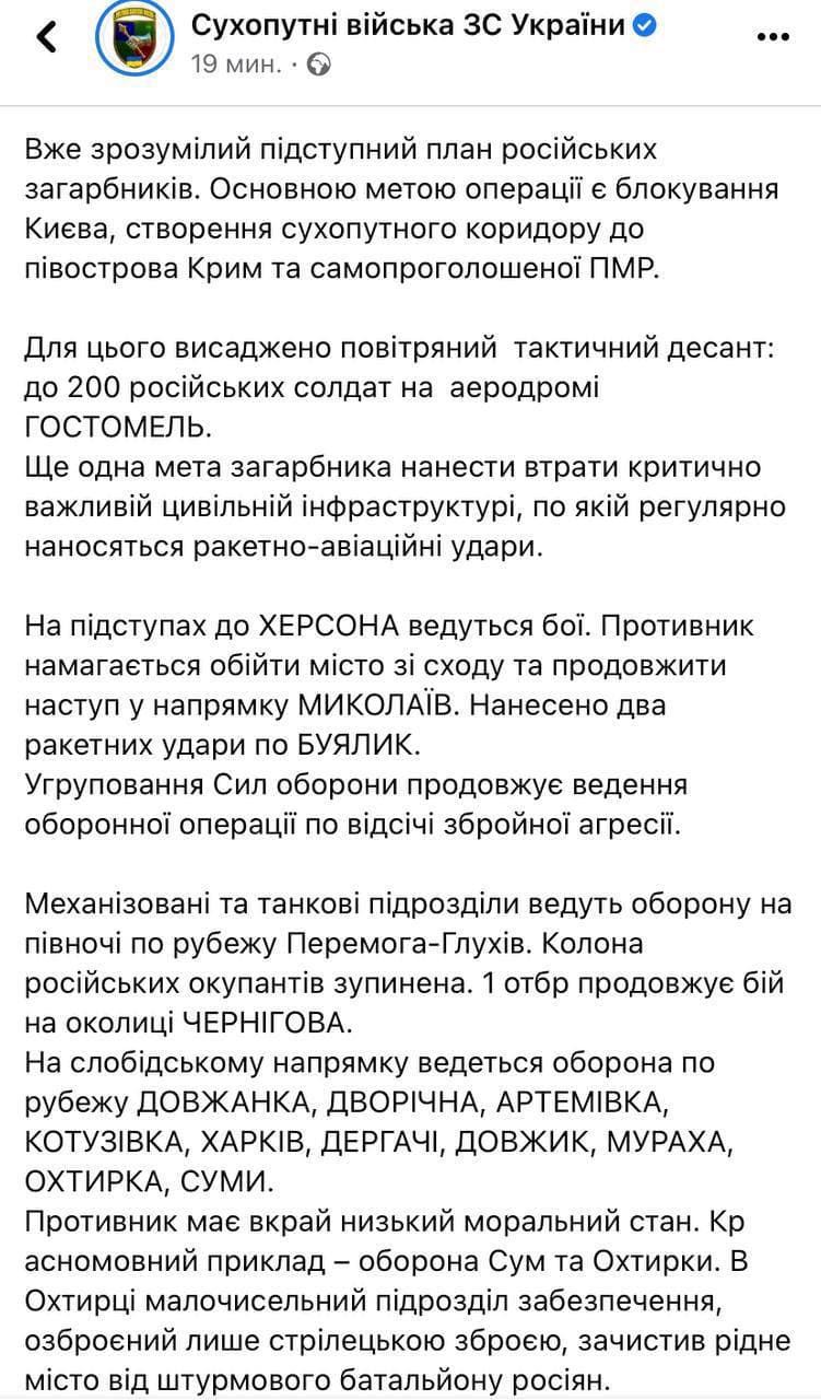 Идут бои за аэропорт Гостомель в котором был высажен российский десант из 200 человек (по утверждению Арестовича десант уже уничтожен).