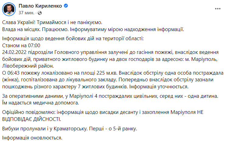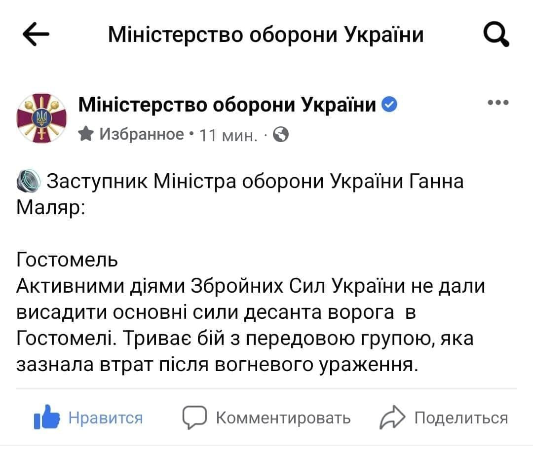 23:15 По аэропорту в Гостомеле снова противоречивая информация. После того как Арестович и Геращенко заявили, что аэропорт взят их поправила заместитель министра обороны Маляр. Говорит, что бой продолжается.