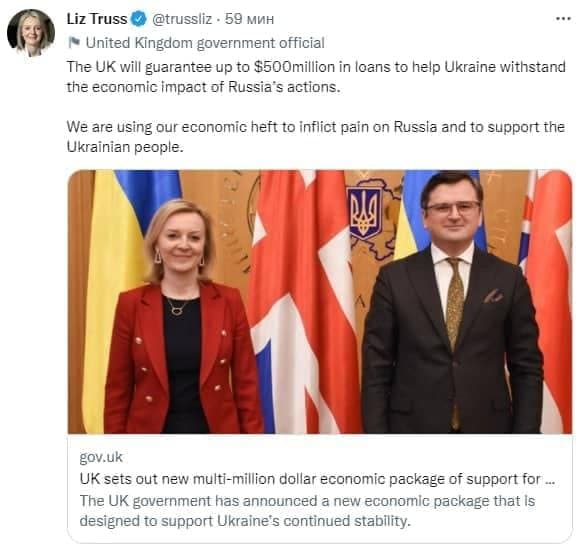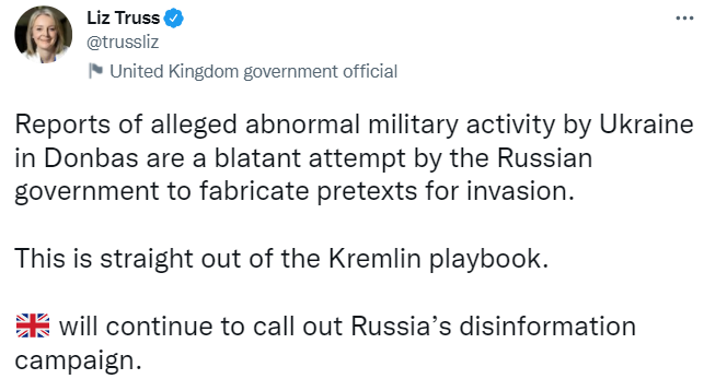 14:33 Глава МИД Великобритании Трасс: "Сообщения о якобы ненормальной военной активности Украины на Донбассе являются вопиющей попыткой российского правительства сфабриковать предлоги для вторжения".