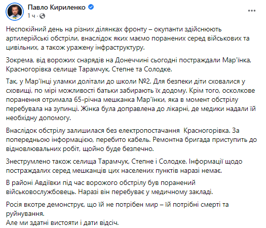 По словам Кириленко, в районе Авдеевки при обстреле был ранен украинский военнослужащий, в настоящее время он находится в медучреждении.