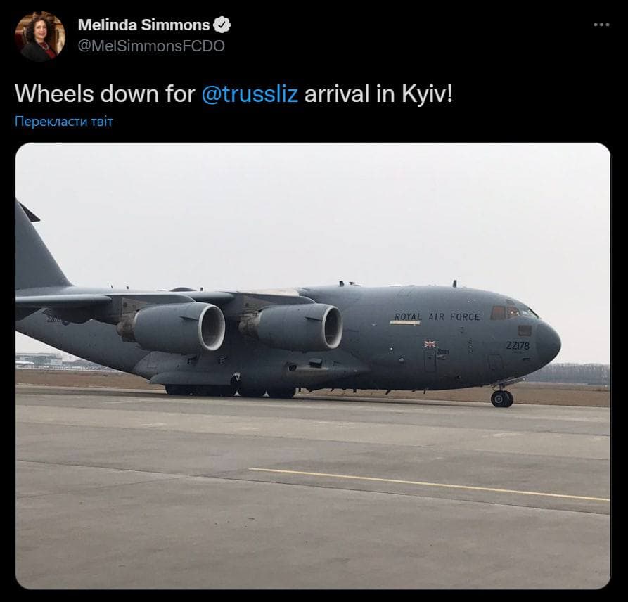 Самолет, на котором прибыла Трасс. Фото: Твиттер посла Британии в Украине Мелинды Симмонс