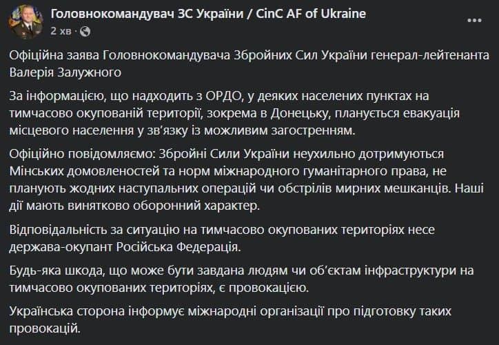 Но тему подхватил глава ВСУ Залужный. Который заявил, что в "ДНР" (в частности, в Донецке) готовят эвакуацию населения. И использовал это как повод ещё раз сказать, что украинская армия наступления не планирует.