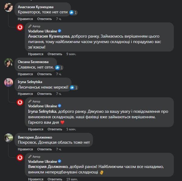 Пользователи в Facebook сообщают, что связи Vodafone нет у жителей подконтрольных Украине населенных пунктов: Славянска, Краматорска, Покровска, Белокуракино, Северодонецка и других городов.