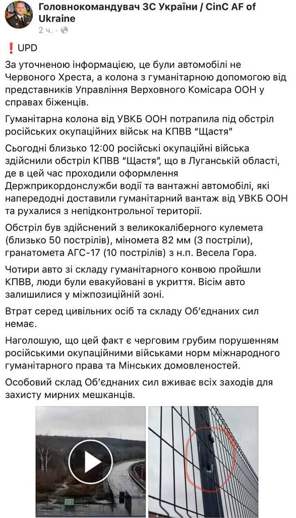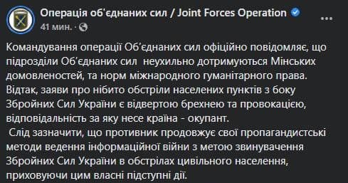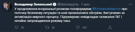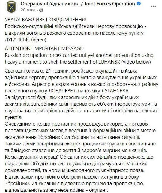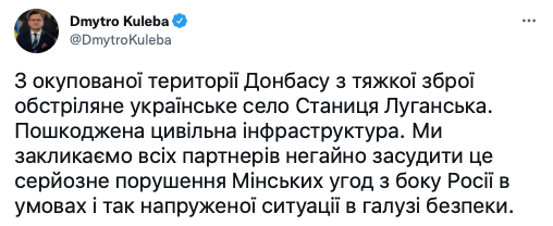 "С оккупированной территории Донбасса из тяжелого оружия обстреляно украинское село Станица Луганская. Повреждена гражданская инфраструктура. Мы призываем всех партнеров немедленно осудить это серьезное нарушение Минских соглашений со стороны России в условиях и без того напряженной ситуации в области безопасности".