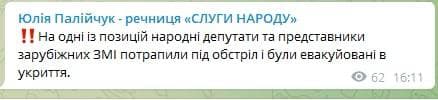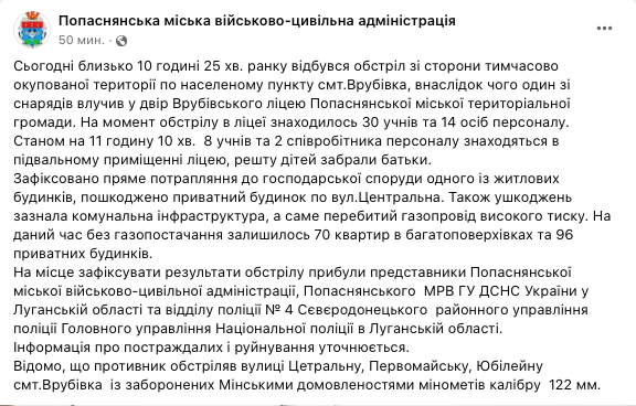 13:08 "Сегодня около 10 часов 25 минут произошел обстрел со стороны временно оккупированной территории по населенному пункту пгт. Врубовка, в результате чего один из снарядов попал во двор Врубовского лицея. На момент обстрела в лицее находились 30 учеников и 14 человек персонала. По состоянию на 11 часов 10 минут 8 учеников и 2 сотрудника персонала находятся в подвальном помещении лицея, остальные дети забрали родители.