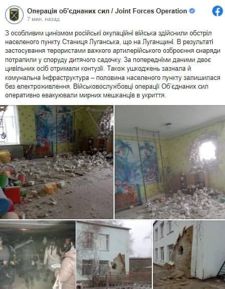 "Российский обстрел Станицы Луганской, на контролируемой украинским правительством территории Донбасса, ударил по детскому саду, ранены двое учителей и отключил электричество в поселке. Агрессор на Донбассе понятен - Россия. Эта атака, как и многие другие, чудовищное нарушение Минских соглашений и снова показывает, как Россия пренебрегает жизнями гражданских по обе стороны линии разграничения", - написало посольство.