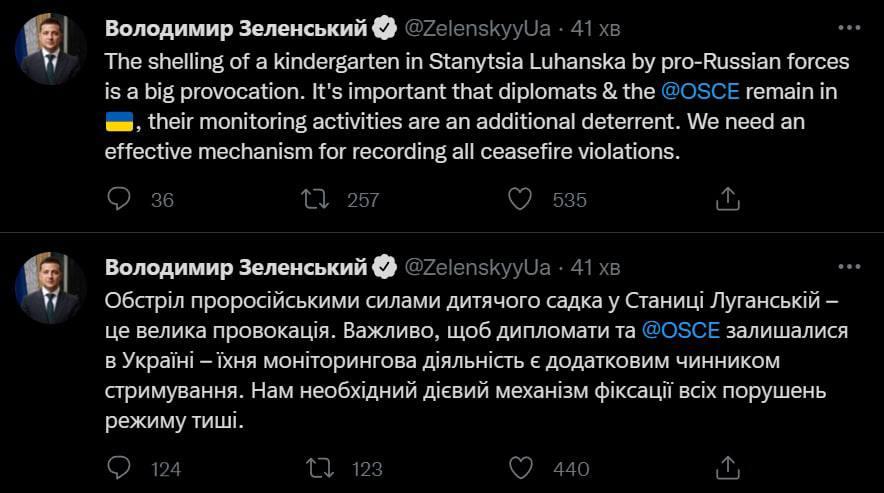 15:04 Президент Владимир Зеленский в Twitter отреагировал на обстрел детского сада в Станице Луганской.