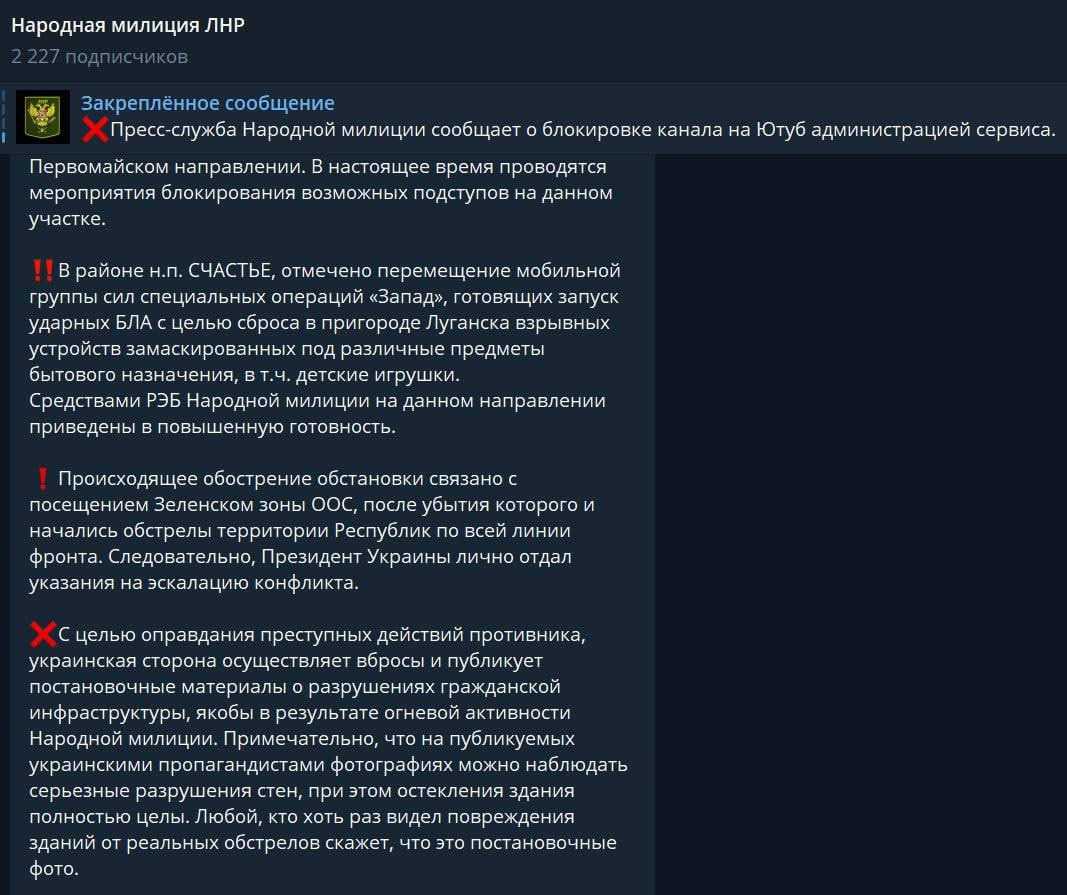 Также "народная милиция" обвиняет Украину в подготовке диверсионных групп и заявляет, что над Луганском готовятся сбрасывать с БПЛА замаскированную под бытовые вещи взрывчатку.