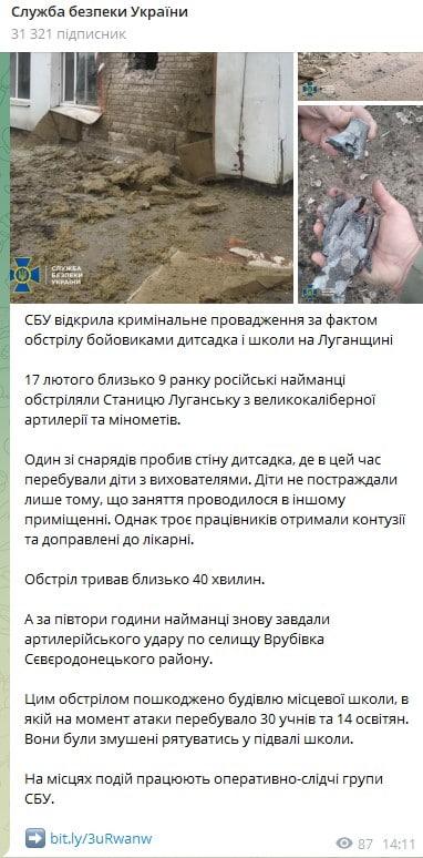 16:04 СБУ открыла уголовное производство по факту обстрела боевиками детского сада и школы в Луганской области по ч. 2 ст. 258 (террористический акт, повлекший тяжкие последствия) Уголовного кодекса Украины. Об этом сообщает сайт СБУ.