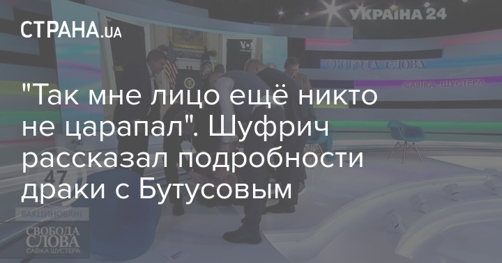 Шуфрич рассказал "Стране" подробности драки, не попавшие в объективы телекамер: "Если ты бьешь - бей". Бутусов сначала ударил мне куда-то в район уха и плеча. Я жалею, что не смог сдержаться и ответил... Я его схватил за шею и зажал под себя, чтоб обездвижить, нас пытались разнять. Я его отпустил и в это время я ему говорю: "Я ж тебя отпустил - отстань". Он схватил меня за шею и хотел бить из-под себя, но получалось плохо. Поэтому в отчаянии он меня зачем-то исцарапал, как меня супруга не царапала. А сверху на мне ещё лежала вся эта банда", - рассказал Шуфрич.