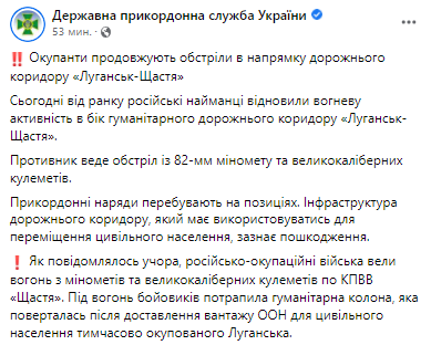 Госпогранслужба Украины опубликовала видео, как утверждается, обстрела в районе КПВВ "Счастье". По данным пограничников, противник ведет обстрел коридора "Луганск-Счастье" из 82-мм миномета и крупнокалиберных пулеметов.