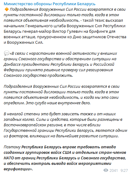 "Мы не приемлем диктата и односторонних, ущемляющих белорусскую сторону, подходов. Политика по расширению НАТО на Восток расценивается нами как агрессивная и ничем не обоснованная. Она не обеспечивает стабильность в Восточноевропейском регионе, а наоборот, повышает вероятность вооруженного конфликта. Происходит эскалация напряженности. И не с территории Беларуси. Все это привело к необходимости проведения комплекса мер по сдерживанию от подобных агрессивных проявлений и угрозы применения силы в отношении Республики Беларусь и Союзного государства в целом", - сообщил Гулевич.