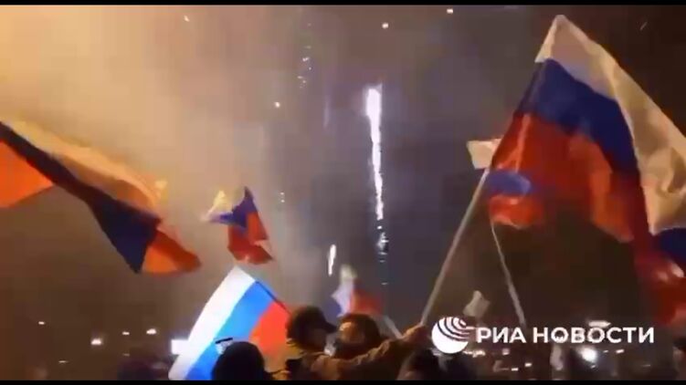 На кадрах видно, как жители Донецка размахивают российскими триколорами, а на улице при этом звучит государственный гимн РФ и запускают фейерверк.