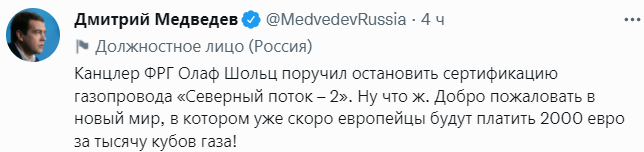 Кроме того, после заявления Шольца начала расти цена газа, которая вновь превысила 900 долларов за тысячу кубометров. После чего замглавы Совбеза России Медведев заявил, что газ Европа теперь будет покупать по 2000 долларов.
