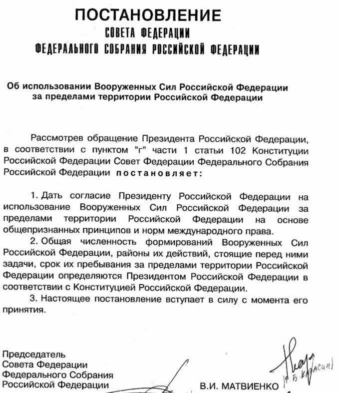 К вечеру Путин запросил у Совета Федерации разрешения на использование войск за границей и почти немедленно получил согласие. В нем ничего не говорится о том, куда и сколько военных будут отправлять, оставив это на усмотрение Путина .