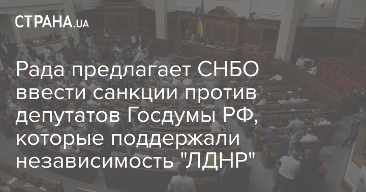 Верховная Рада предлагает Совету национальной безопасности и обороны Украины (СНБО) ввести на десять лет санкции в отношении депутатов Госдумы России, которые поддержали независимость "ДНР" и "ЛНР".