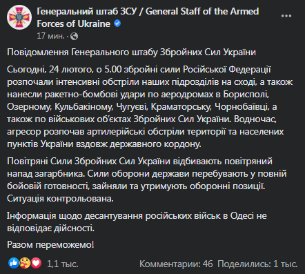 В ВСУ заявляют, что 24 февраля, в 05:00, вооруженные силы Российской Федерации приступили к интенсивным обстрелам их подразделений на востоке, а также нанесли ракетно-бомбовые удары по аэродромам в Борисполе, Озерном, Кульбакино, Чугуеве, Краматорске, Чернобаевке и по военным объектам Вооруженных Сил Украины.
