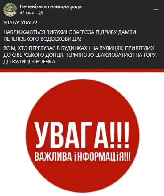 "Всем, кто находится в домах и на улицах, прилегающих к Северскому Донцу, нужно немедленно эвакуироваться на гору, к улице Зинченко", - сообщает Печенежский сельсовет.