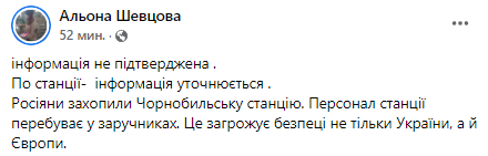 "Россияне захватили Чернобыльскую станцию. Персонал станции находится в заложниках. Это чревато безопасностью не только Украины, но и Европы", - написала Шевцова.