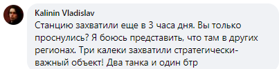 "Вы только проснулись? Я боюсь представить, что там в других регионах. Три калеки захватили стратегически-важный объект! Два танка и один БТР", - написал пользователь с ником Владислав Калинин.