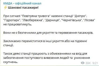 09:27 Объявление для киевлян: при сигнале "Воздушная тревога" наземные станции "Днепр", "Гидропарк", "Левобережная", "Дарница", "Черниговская", "Лесная" не будут работать.