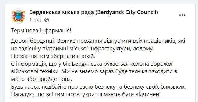 - Российская армия штурмовала погранпункт Приморский Посад в Запорожской области (менее ста километров до Бердянска)