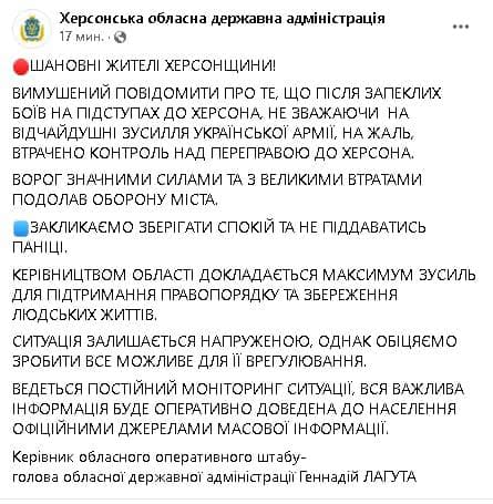 Под Херсоном РФ пытается перейти Днепр, Украина держит оборону на правом берегу.