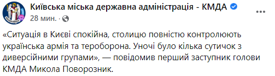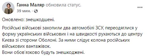 09:29 Замминистра бороны Анна Маляр написала, что были обезврежены российские военные, которые захватили два автомобиля ВСУ, переоделись в форму украинских военных и на скорости двигались в центр Киева со стороны Оболони. За ними следовала колонна российских военных грузовиков.