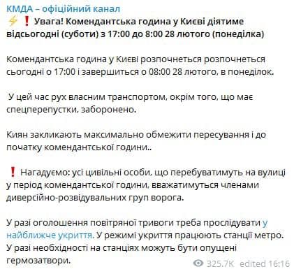 11:46 В связи с введенным в Киеве комендантским часом пассажирам, прибывающим в город, не разрешат покидать территорию вокзала до окончания комендантского часа (завтра в 08:00).