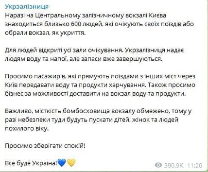12:40 На ж/д вокзале в Киеве заканчиваются запасы воды и еды. Там находится 600 человек.