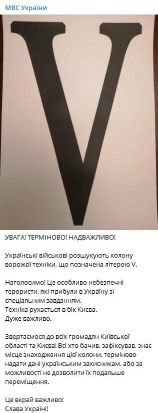 12:51 МВД Украины сообщает, что украинские военные разыскивают колонны военной техники россиян, обозначенную буквой V.