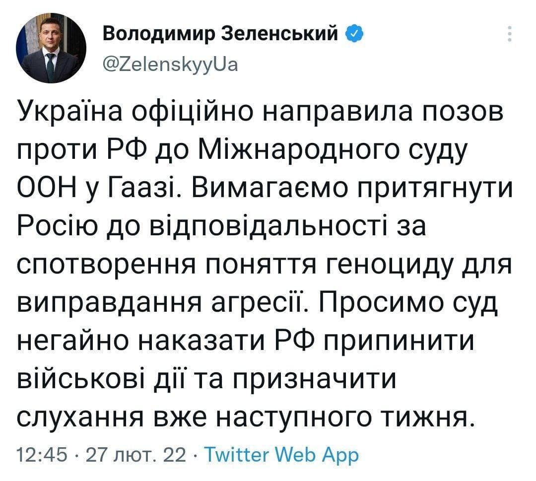 12:52 Украина официально подала обращение в Гаагский трибунал по поводу нападения России.