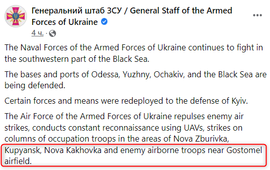 По состоянию на три часа ночи Генштаб сообщал, что ВСУ отражают удары авиации и десант противника в районе аэродрома Гостомель.