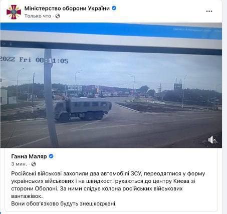 09:00 Заместитель министра обороны Украины Анна Маляр пишет, что российские военные захватили несколько автомобилей ВСУ и движутся на Киев.