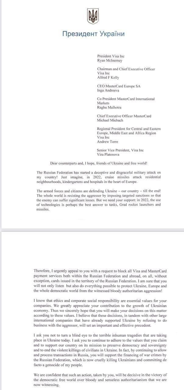 Зеленский обратился к Visa и MasterCard с просьбой запретить работу карт для всей России, а не только подсанкционных предприятий. В Верховной раде призвали распространять обращение во всех соцсетях.