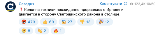 "Колонна техники неожиданно прорвалась с Ирпеня и двигается в сторону Святошинского района в столице", - говорится в сообщении.