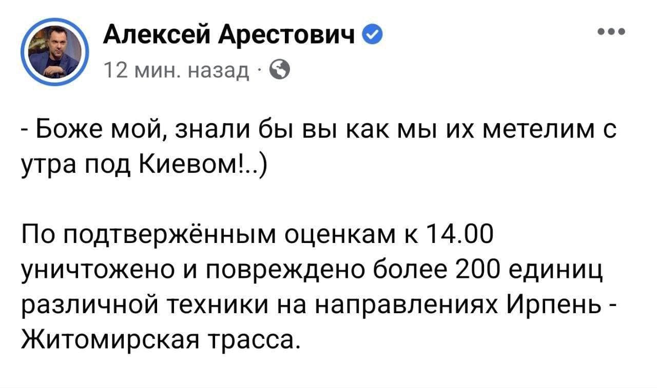 20:24 В Бровары заходит российская техника - заявил Алексей Дорошенко, депутат горсовета. Бровары - это левый берег Днепра. То есть, россияне заходят в Киев с востока. Позже депутат горсовета Броваров Дорошенко уточнил, что в Бровары зашли не российские войска, а диверсионные группы.
