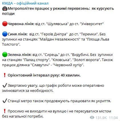 07:27  Киевская мэрия сообщает, что с 8 часов утра можно уже выходить на улицу, будут открыты магазины и заработает метро (правда, поезда будут ходить реже).