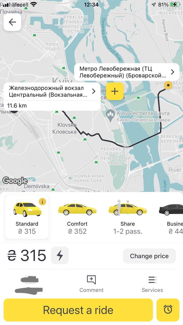 Если вы на левом берегу - ездит такси. Например, с Левобережной до ж/д-вокзала днем можно доехать за 315 гривен.