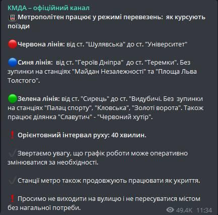 Метро работает с интервалом 1 поезд в 40 минут в одну сторону. На красной ветке поезда ходят от Шулявской до Университета.