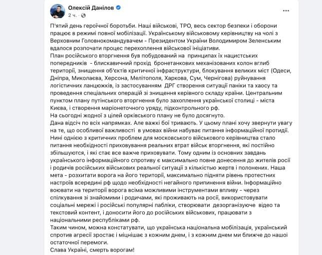 "Пятый день героической борьбы. Наши военные, ТРО, весь сектор безопасности и обороны работают в режиме полной мобилизации. Украинскому военному руководству во главе с Верховным Главнокомандующим - Президентом Украины Владимиром Зеленским удалось начать процесс перехвата военной инициативы", - заявил Данилов.
