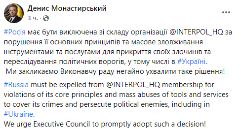 "Россия должна быть исключена из состава организации Интерпол за нарушение ее основных принципов и массовое злоупотребление инструментами и услугами для прикрытия своих преступлений и преследования политических врагов, в том числе в Украине.