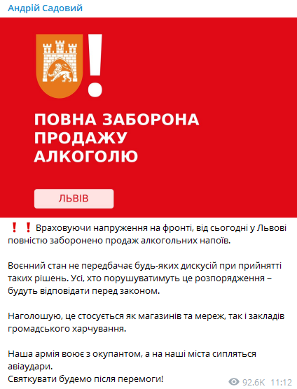 "Учитывая напряжение на фронте, с сегодняшнего дня во Львове полностью запрещена продажа алкогольных напитков. Военное положение не предусматривает каких-либо дискуссий при принятии таких решений. Все, кто будет нарушать это распоряжение, будут отвечать перед законом", - говорится в сообщении.