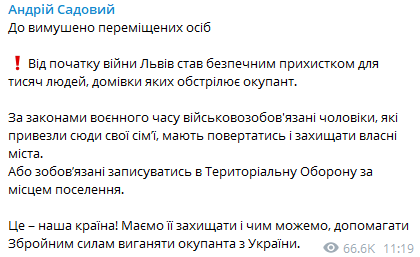 "С начала войны Львов стал безопасным пристанищем для тысяч людей, дома которых обстреливает оккупант. По законам военного времени военнообязанные мужчины, привезшие сюда свои семьи, должны возвращаться и защищать собственные города. Либо обязаны записываться в Территориальную Оборону по месту поселения", - написал Садовой.