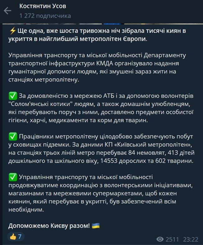 В находящемся под обстрелом российской армии Киеве в метро фактически переселились более 15 тысяч жителей столицы. Такую информацию озвучил замглавы КГГА Константин Усов.