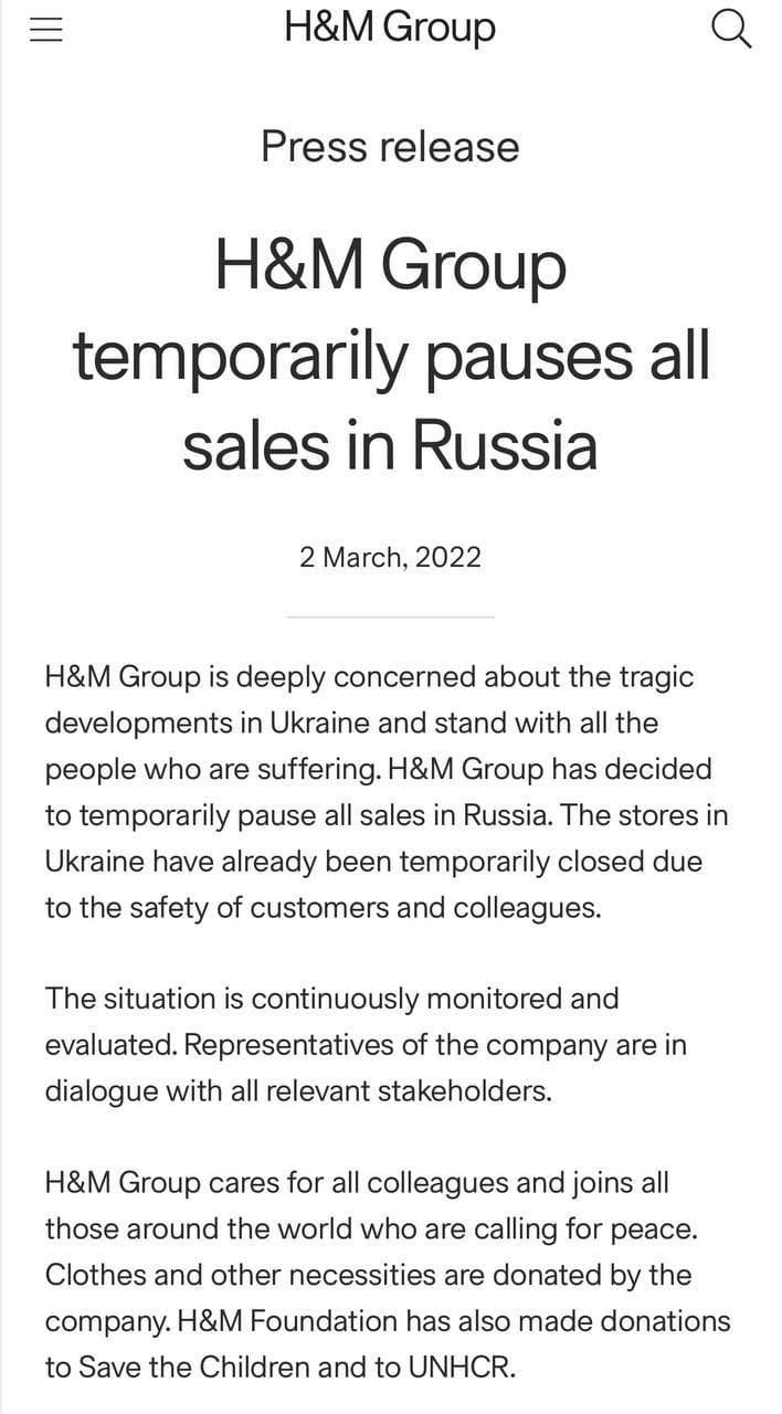 "H&M Group глубоко обеспокоена трагическими событиями в Украине и поддерживает всех страдающих людей. H&M Group решила временно приостановить все продажи в России. Магазины в Украине уже были временно закрыты из-за безопасности клиентов и коллег. Ситуация постоянно контролируется и оценивается. Представители компании находятся в диалоге со всеми соответствующими заинтересованными сторонами", - говорится в сообщении компании.
