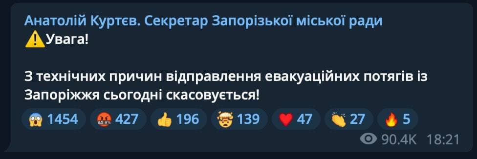 18:35 Из Запорожья сегодня отменили эвакуационные поезда.
